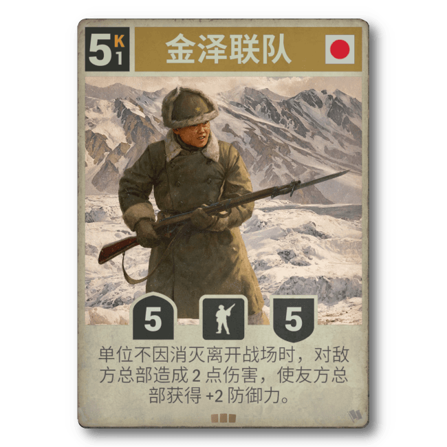 效果:单位不因消灭离开战场时,对敌方总部造成 2 点伤害,使友方总部获得 +2 防御力。