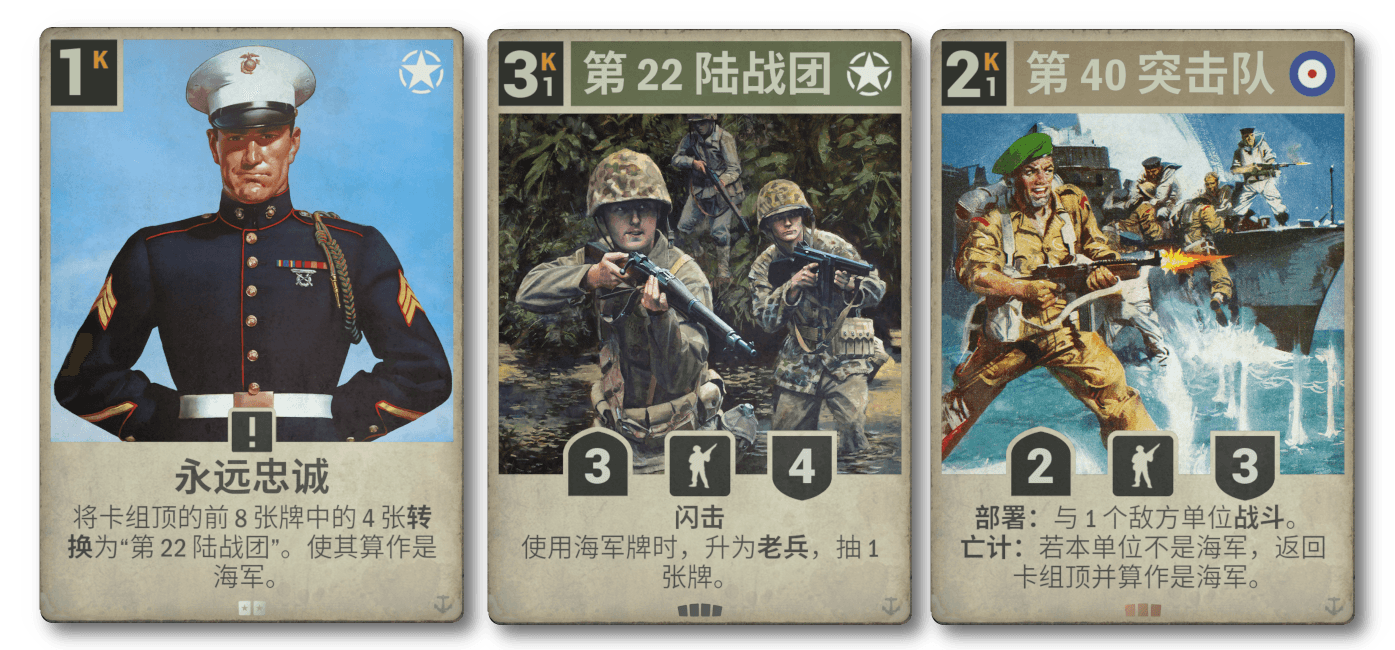 KARDS 的海战并不意味着把舰队开上前线。为保证游戏的陆基战斗重点以及历史准确性,海军将继续通过指令和反制卡牌表现,而非单位卡牌。毕竟,虎式坦克与密苏里号之间的单位交换很难界定。(要怎么给她分配属性值呢?)